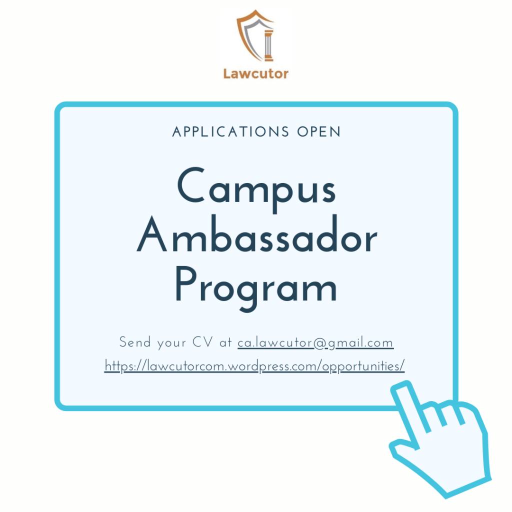 Kindly send an email to ca.lawcutor@gmail.com attaching your CV and expressing your interest to become a Lawcutor Campus Ambassador ( in a separate word document emphasizing as to Why do you want to become campus Ambassador, Why you should be selected as a Lawcutor Campus Ambassador and Ways in which you can bring awareness or make people know about the organization). The subject of the email must be “Application for Lawcutor Campus Ambassador Program 2020”.