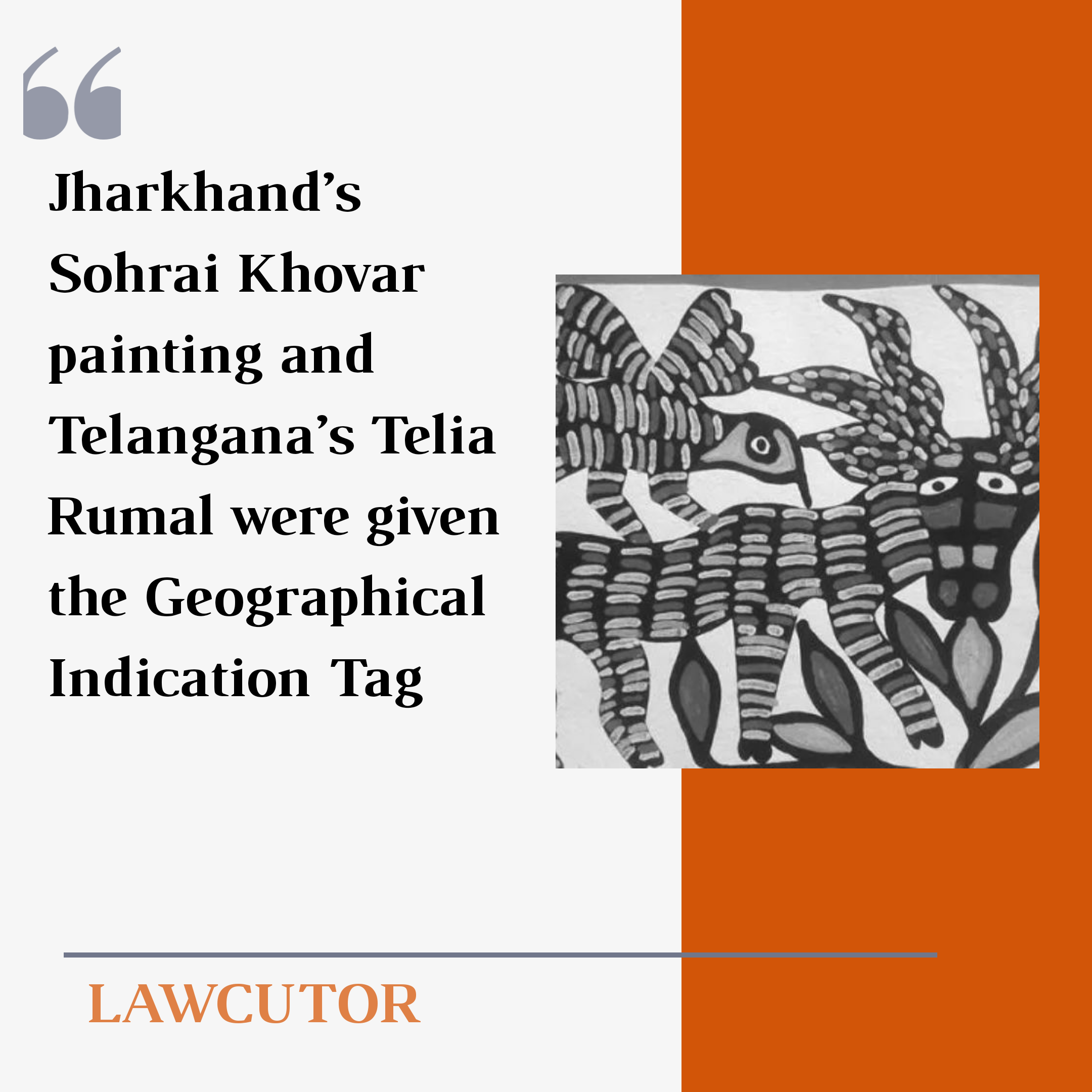 Jharkhand’s Sohrai Khovar painting and Telangana’s Telia Rumal were given the Geographical Indication (GI) tag by the Geographical Indications Registry headquartered in Chennai.