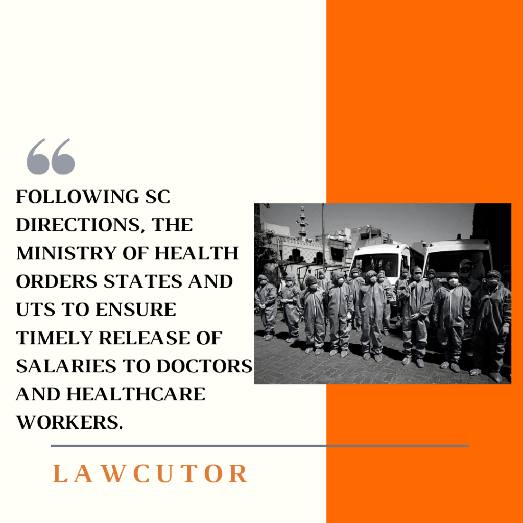 The union ministry of health and family welfare ( MHFW) has issued an order under the disaster management act, 2005 ( DMA) has passed an order, notifying all the states and union territories to hand over the salaries of doctors and other health workers on time.