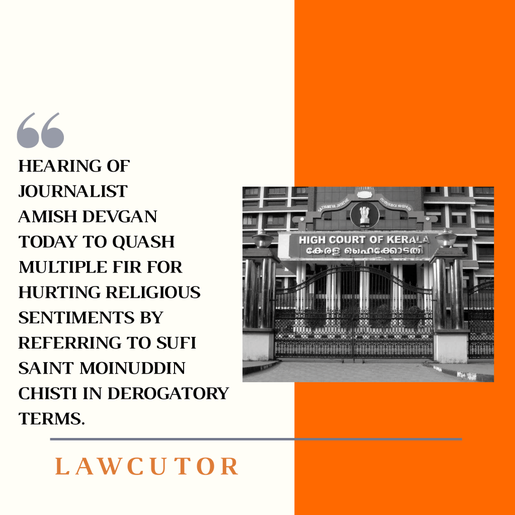 Today SC will hear the plea of Journalist Amish Devgan who was seeking to quash the multiple FIR registered against him for hurting religious sentiments by referring to Sufi saint Moinuddin Chisti in derogatory terms. A Vacation Bench led by Justices AM Khanwilkar and Dinesh Maheshwari will hear this plea.