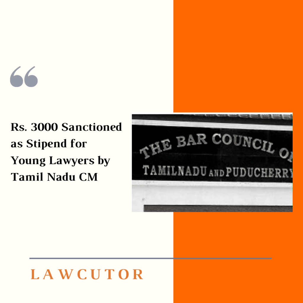 The Bar Council of Tamil Nadu and Puducherry has informed that an amount equal to Rs. 3000 has been sanctioned as monthly stipend for the young advocates practicing in the state for a period of two years by Chief Minister of the State.