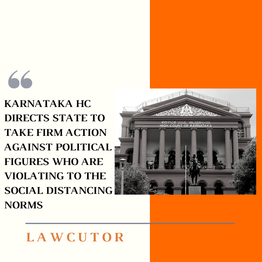 The High Court of Karnataka has directed the State on Friday to take strict actions against political figures who are not following the social distancing norms and are not wearing masks in public. HC said that it comes under violation of provisions of Disaster Management Act.