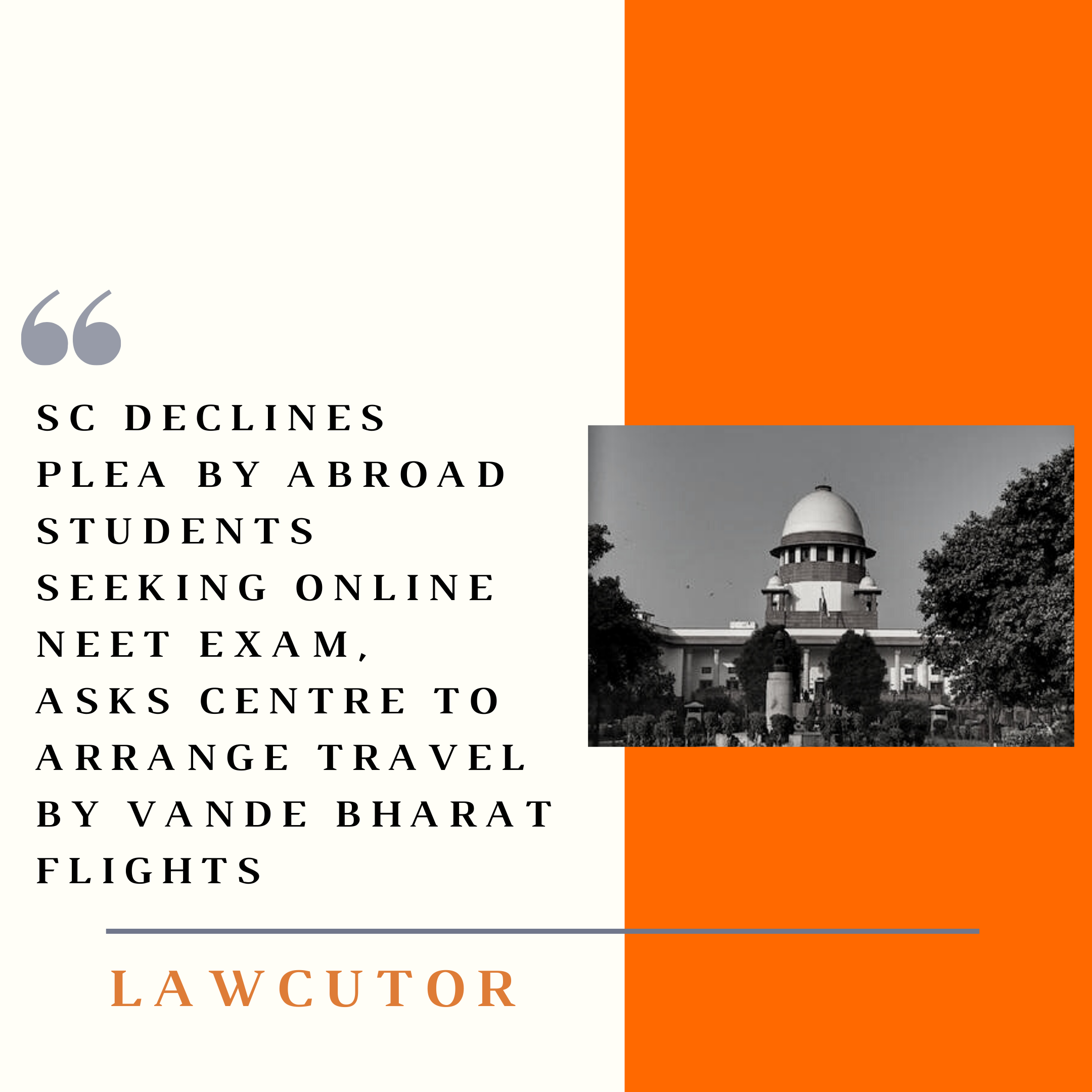The Supreme Court on Monday declined a plea to allow online exam centres for students in foreign countries to appear in the National Eligibility cum Entrance Test (NEET) 2020 for admission to medical courses. A bench comprising Justices Nageswara Rao, Hemant Gupta & S. Ravindra Bhat asked the Central Government to arrange the candidates’ travel from abroad via Vande Bharat mission flights, to make travel for students easier.