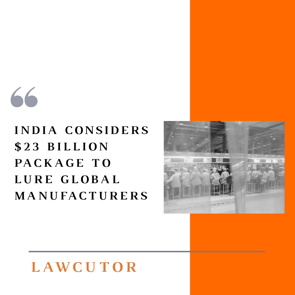 India is planning to offer incentives worth 1.68 trillion rupees ($23 billion) to attract companies to set up manufacturing in the South Asian nation. Prime Minister Narendra Modi’s government will offer production-linked incentives to automobile manufacturers, solar panel makers, and specialty steel to consumer appliance companies. Textile units, food processing plants and specialized pharmaceutical product makers are also being considered for the plan.