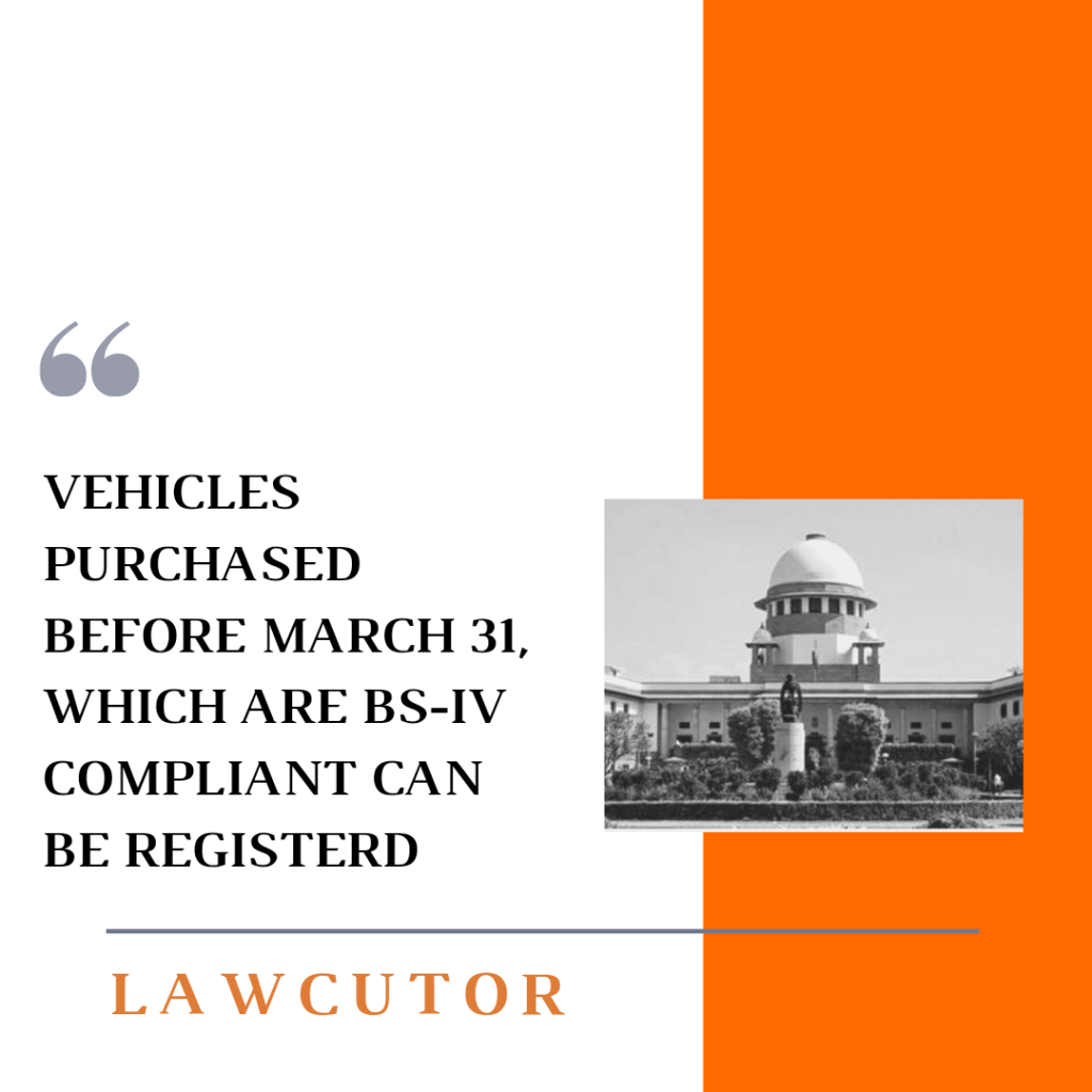 A Supreme Court bench comprising Chief Justice SA Bobde, Justices AS Bopanna, V. Ramasubramanian has allowed Public Utility Vehicles which are BS-IV complaint purchased before 31st March, to be registered, subject to strict inspection by Environment Pollution Control Authority.