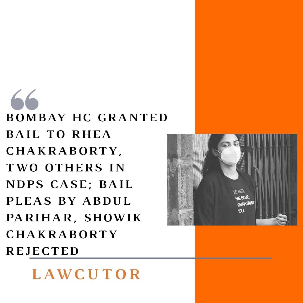 Justice SV Kotwal of the Bombay High Court today granted bail to Bollywood actress Rhea Chakraborty, Dipesh Sawant and Samuel Miranda in cases registered under the Narcotics Drugs and Psychotropic Substances (NDPS) Act by the NCB.