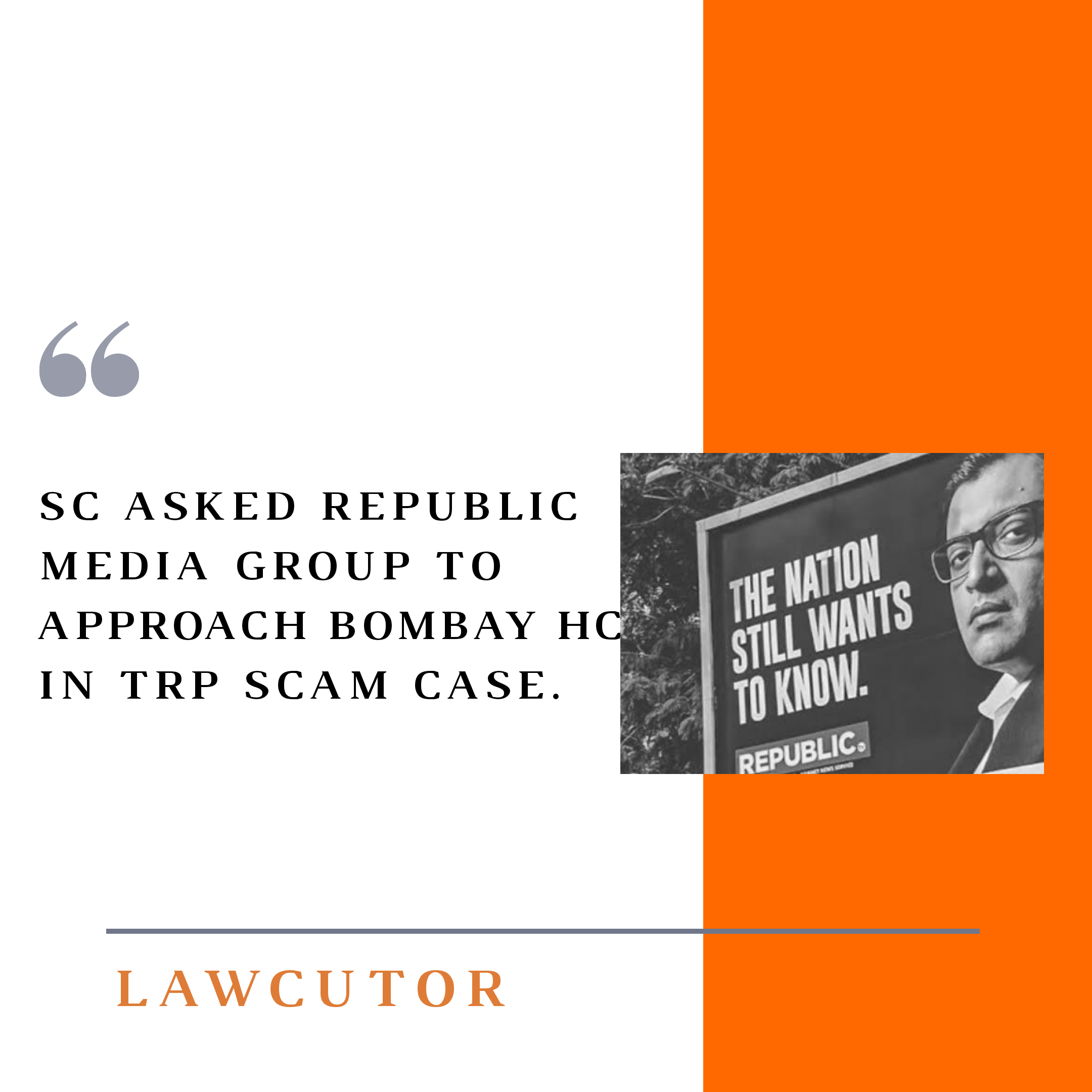 The SC on Thursday ordered the Republic Media Group to bring the TRP case of scam reported by the Mumbai Police before the Bombay High Court. The HC has worked in the COVID–19 pandemic and a media group should approach it since its office is situated in Worli, a bench consisting of the judges D Y Chandrachud, Indu Malhotra and Indira Banerjee said.