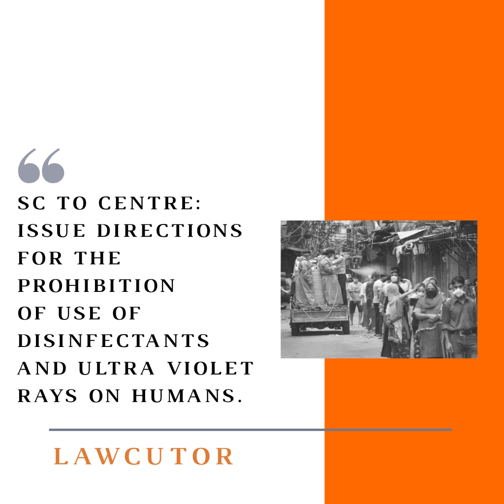 The Supreme Court requested the Center on Thursday to provide guidelines for the prohibition of the use of COVID-19 disinfectants and ultraviolet rays on citizens. In a month’s time, a bench led by Justice Ashok Bhushan called on the Government to do what was required.