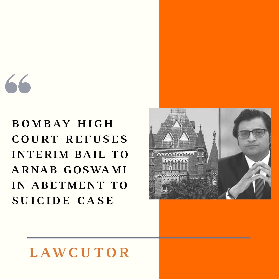 The Bombay High Court on Monday refused to grant interim bail to Republic TV anchor Arnab Goswami, who was arrested and remanded to 14 days judicial custody on November 4, and two co-accused in the 2018 abetment to suicide case.