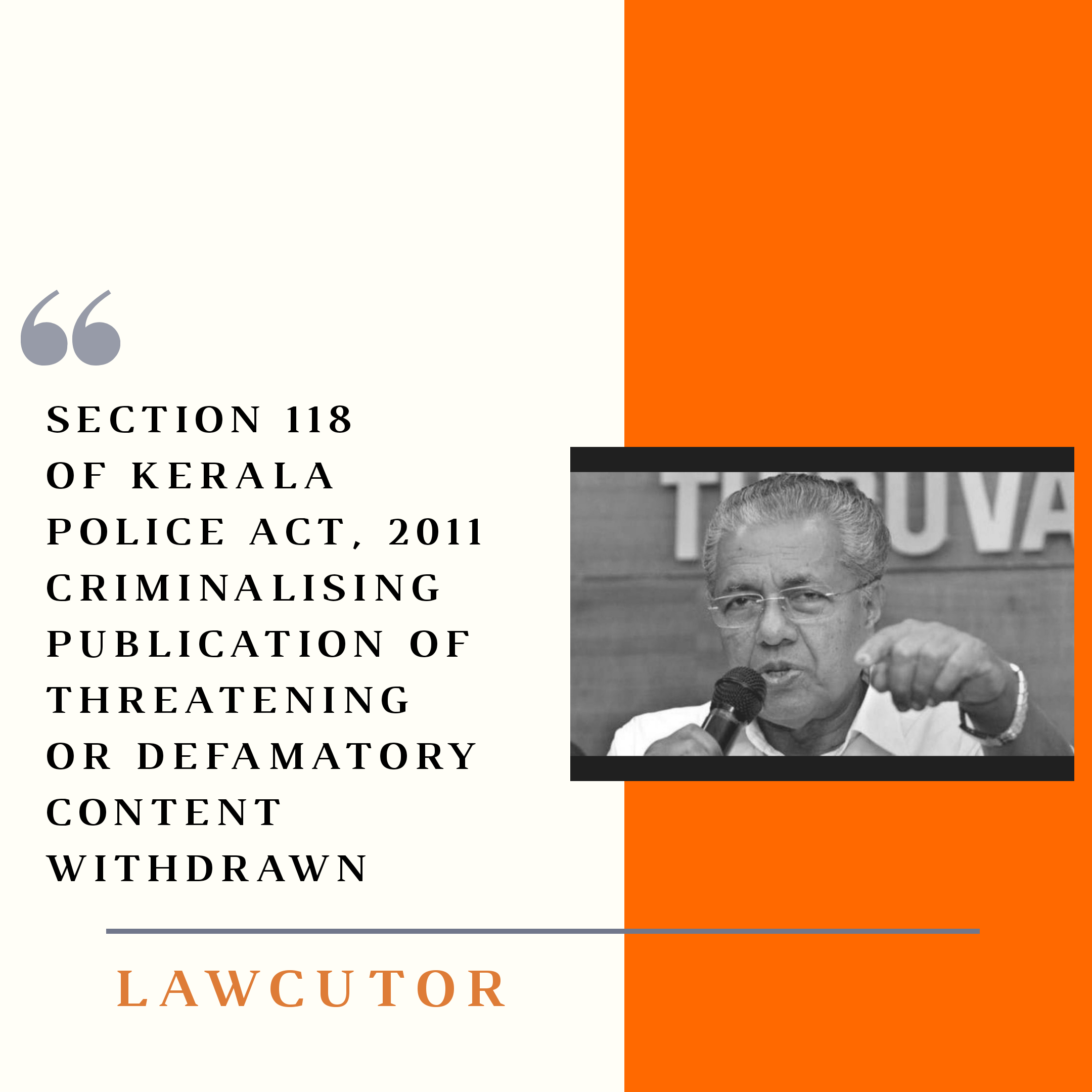 The Pinarayi Vijayan-led government had inserted section 118A to the Kerala Police Act, 2011 that made the expression, publication and dissemination of information that may be threatening, abusive, humiliating or causing injury to the mind of a person (defamatory) when the person publishing or disseminating it knows it to be false, a crime. The section was added with the intent to deal with crimes committed on social media by penalising the said act with three years imprisonment or with a fine of Rs 10, 000 or both.