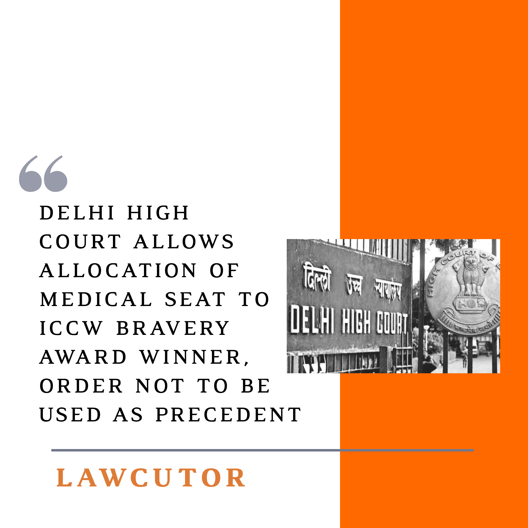 The Delhi High Court has issued direction to the Union of India to allocate a supernumerary medical seat to an Indian Council for Child Welfare (ICCW) Bravery Award winner for the MBBS course, 2019, which under the reservation scheme was reserved for the National Bravery Awardees.