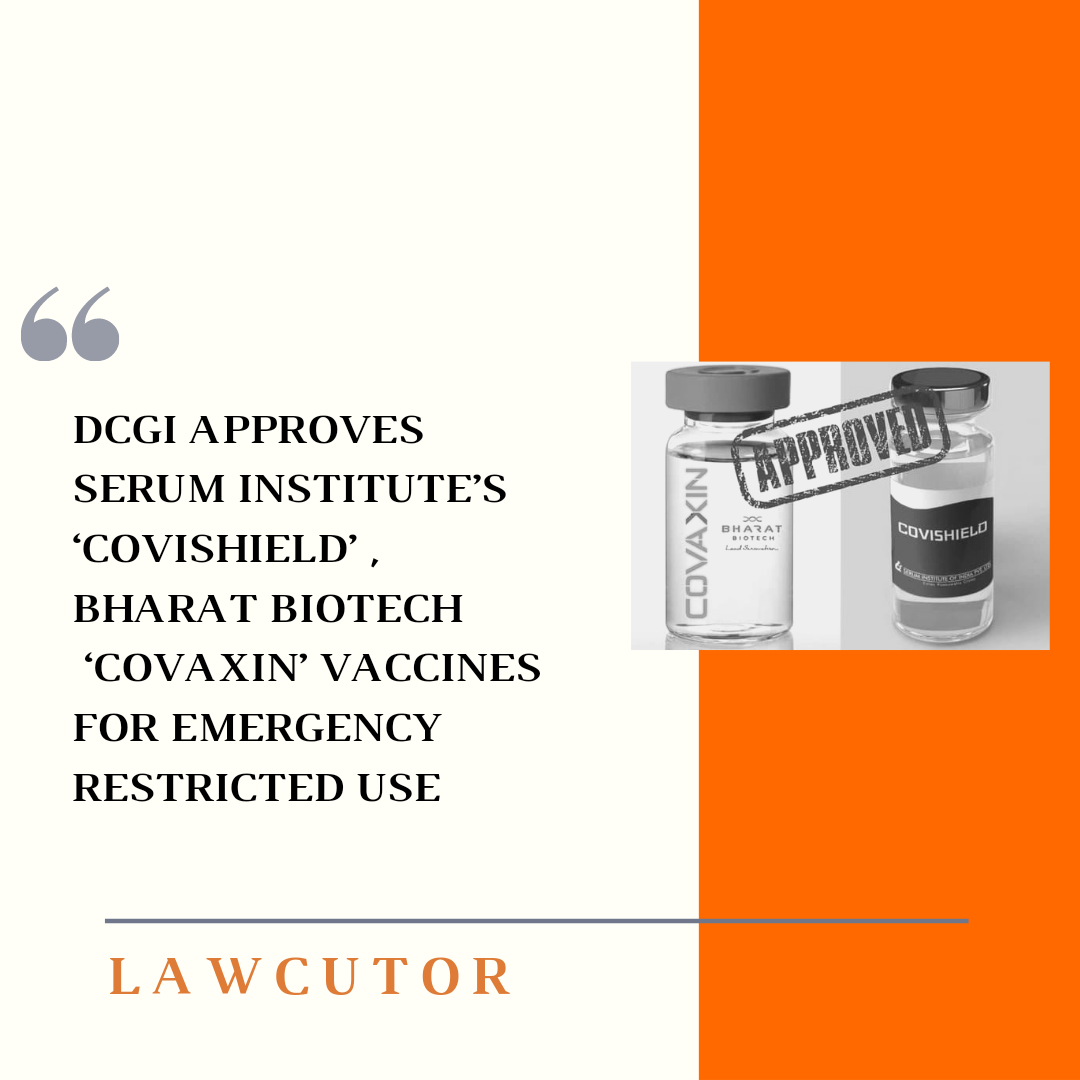 India’s drug controller Drugs Controller General of India(DCGI) has approved Serum Institute of India’s ‘Covishield’ and Bharat Biotech’s ‘Covaxin’ for restricted emergency use.