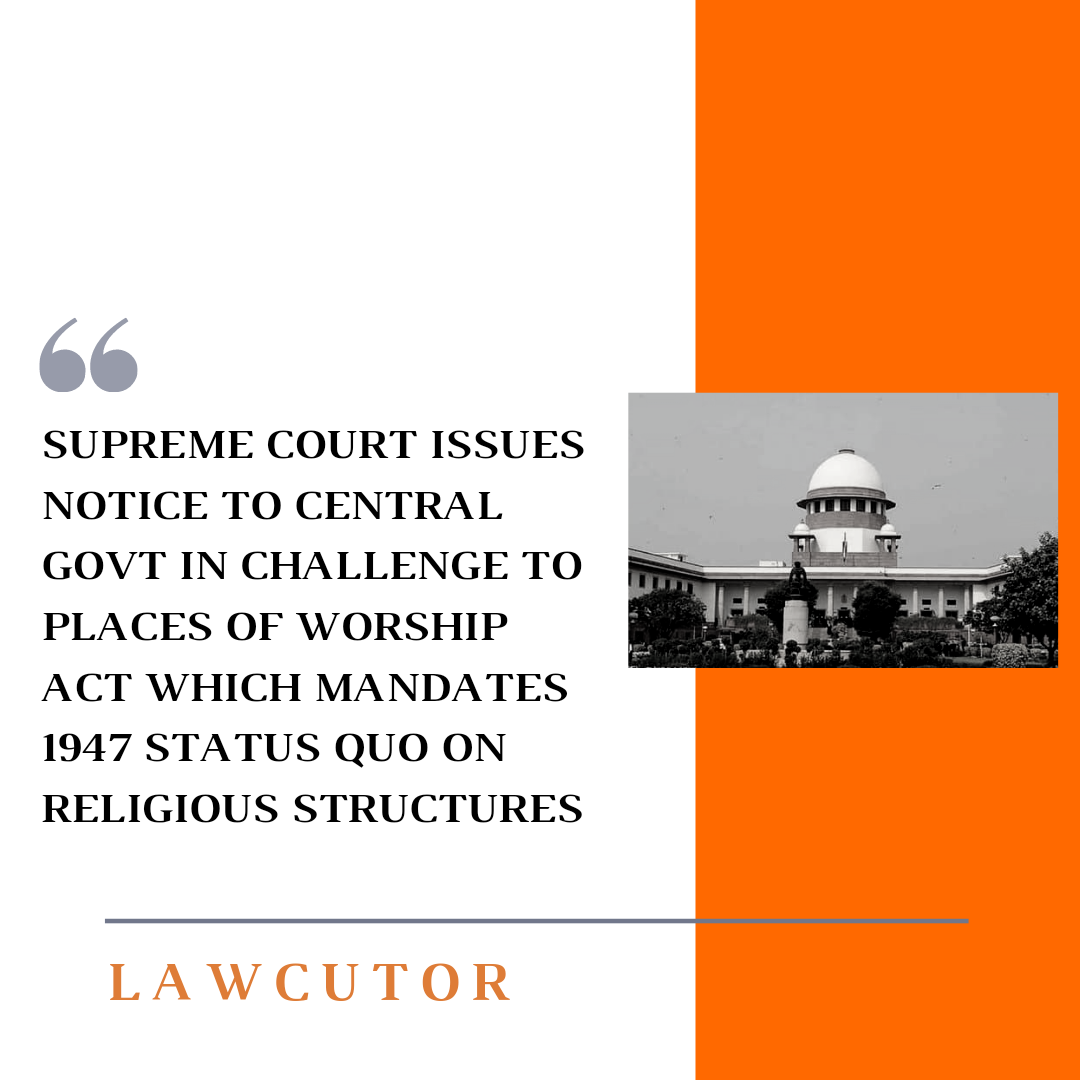 The Supreme Court issued a notice to the Centre on a PIL challenging the constitutional validity of a 1991 law which prohibits the filing of a lawsuit to recover a place of worship or to change its character from what prevailed on the date of independence.