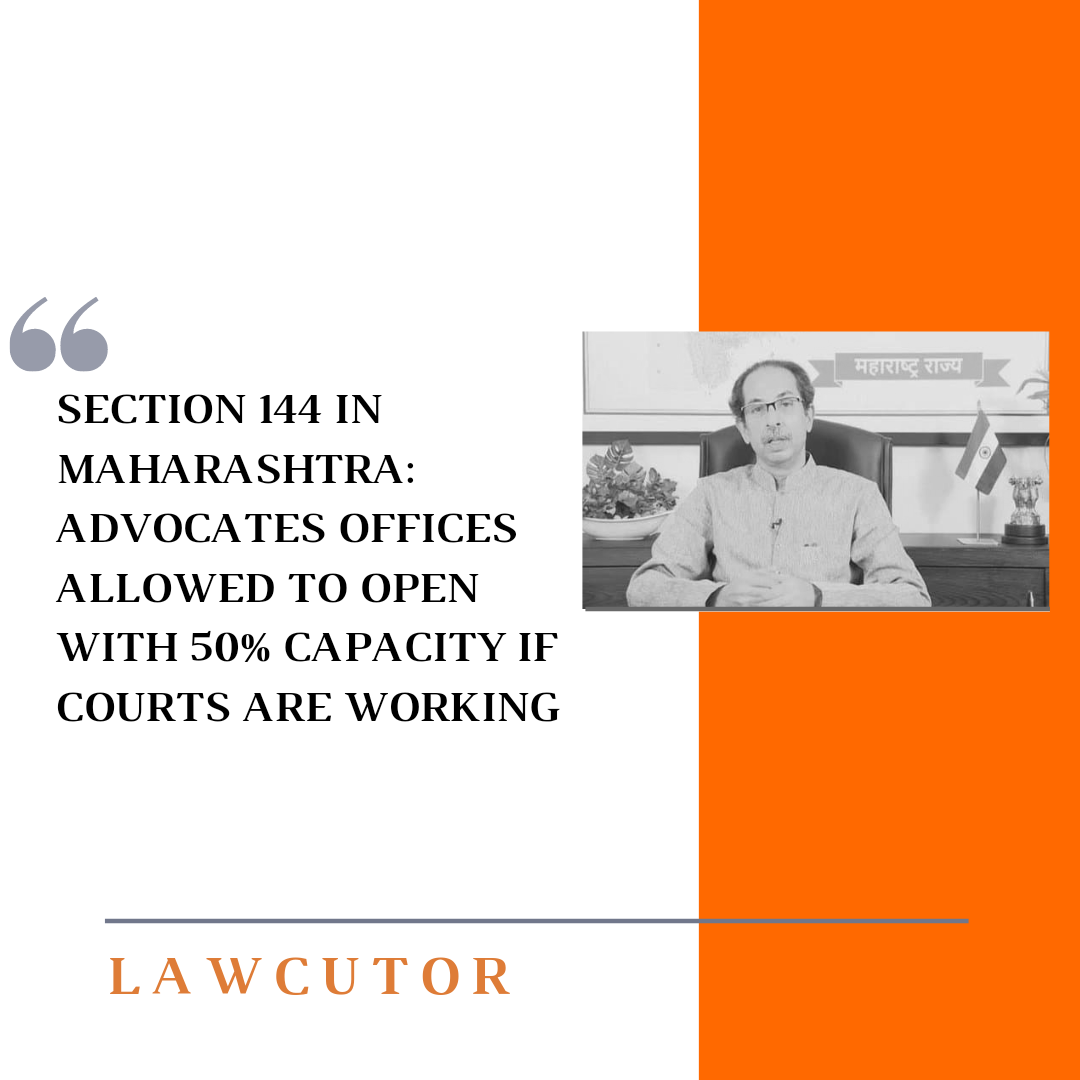 Maharashtra government has listed advocate offices as an exempted category in the latest order issued under section 144 of the code of criminal procedure and also has imposed state wide restrictions on public movement in the wake of Covid -19 surge.