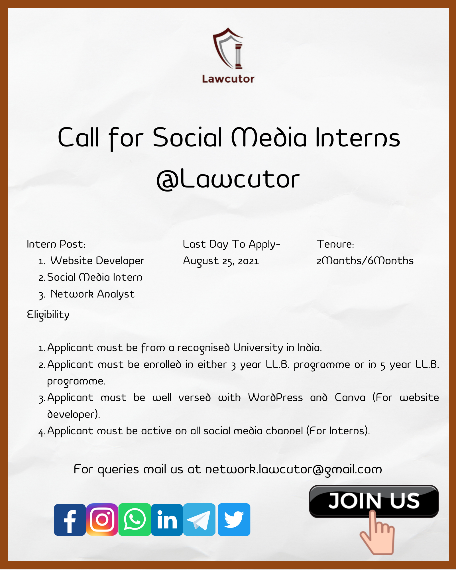 Through this opportunity of social media interns, Lawcutor want to help the legal fraternity in expanding their knowledge more extensively in law and as well as a website developer which will help the interns to expand their network.