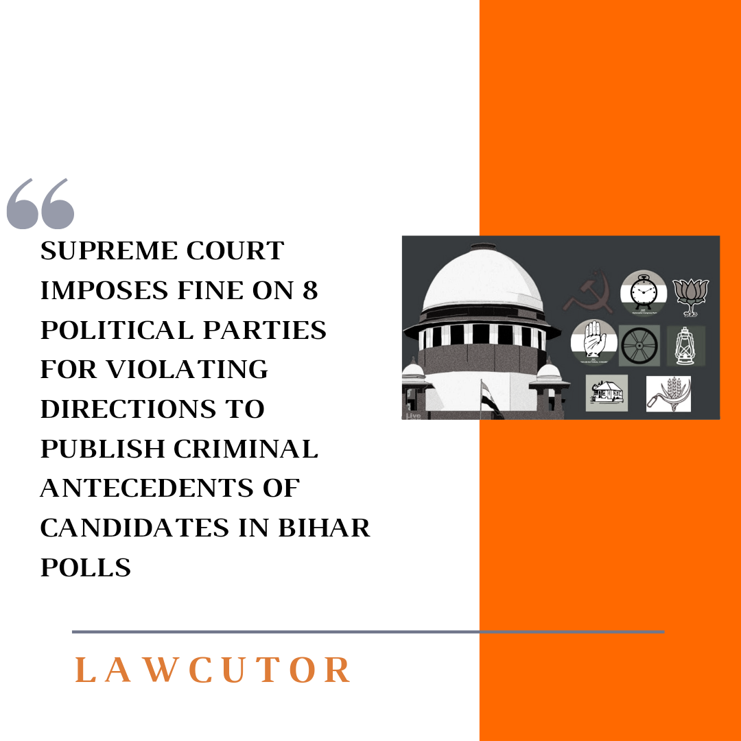 The Supreme Court imposed fine on eight political parties for committing contempt of court by flouting the directions in its February 2020 judgment for publication of the criminal antecedents of candidates during the Bihar assembly polls last year.