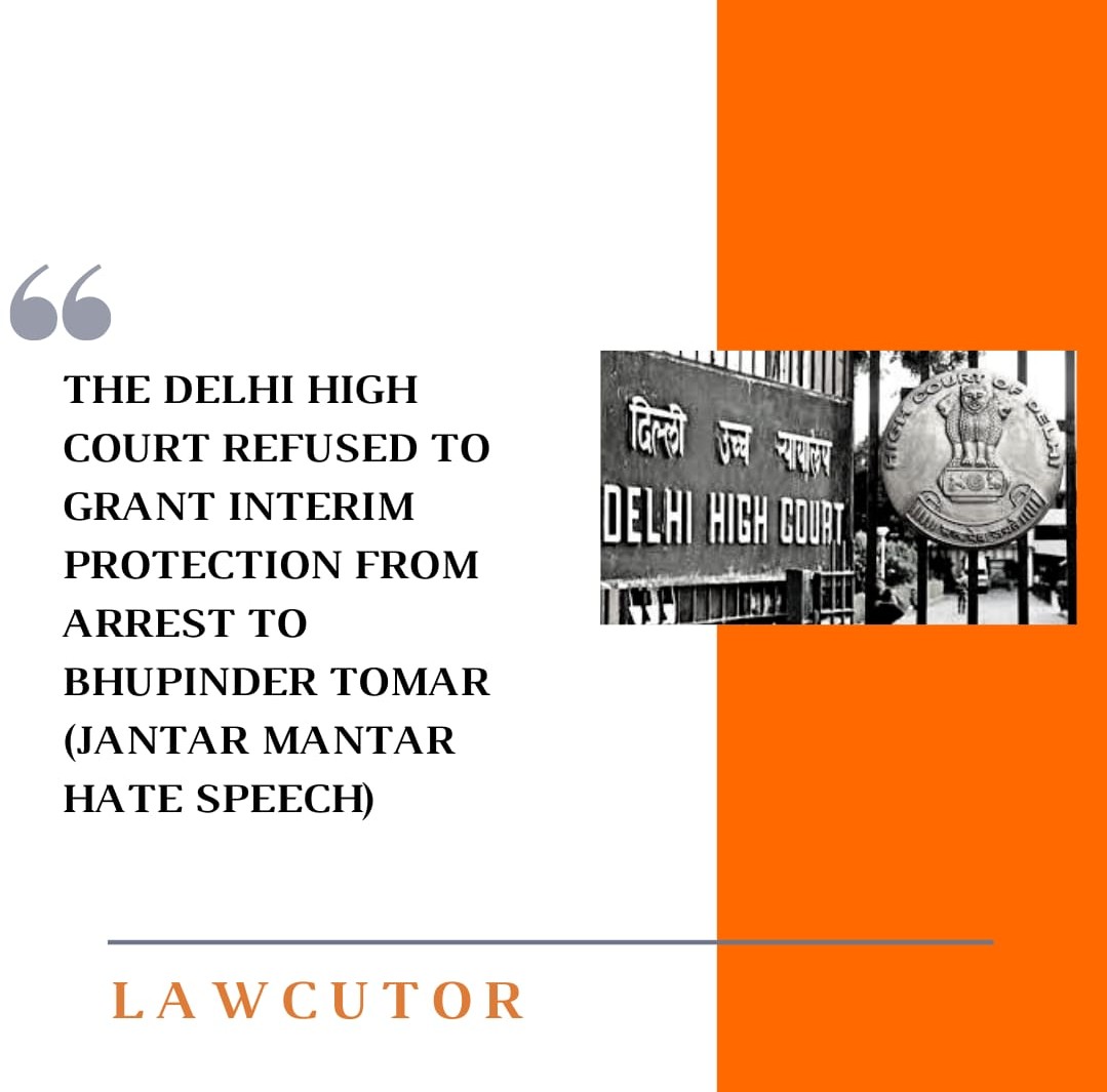 The Delhi High Court Friday refused to grant interim protection from arrest to Bhupinder Tomar alias Pinki Chaudhary who is accused of raising communal slogans and inciting the youth to propagate against a particular religion at a rally at Jantar Mantar on August 8.