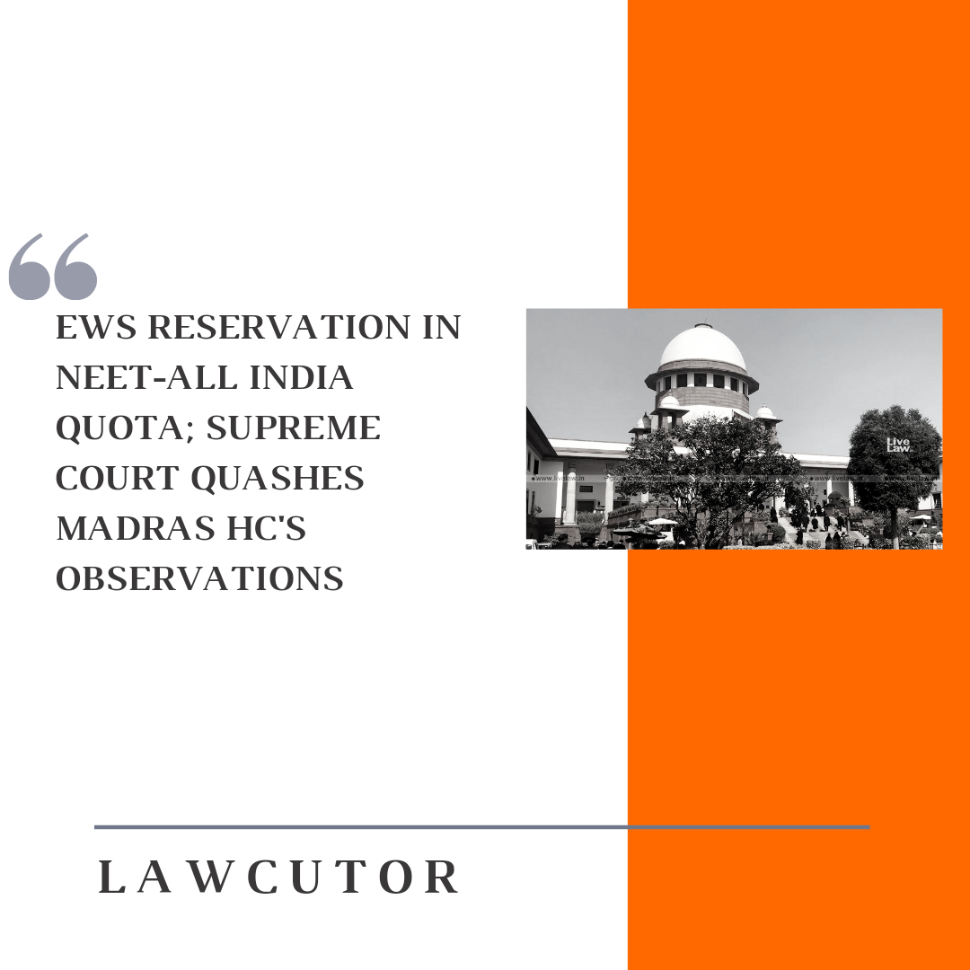 The Supreme Court set-aside the observations made by the Madras High Court’s order which said that the reservation for Economically Weaker Sections(EWS) in the NEET-All India Quota can be implemented only with the approval of the Constitution Bench of the Supreme Court that is examining the correctness of the 102nd Constitution Amendment which provided for economic reservations.