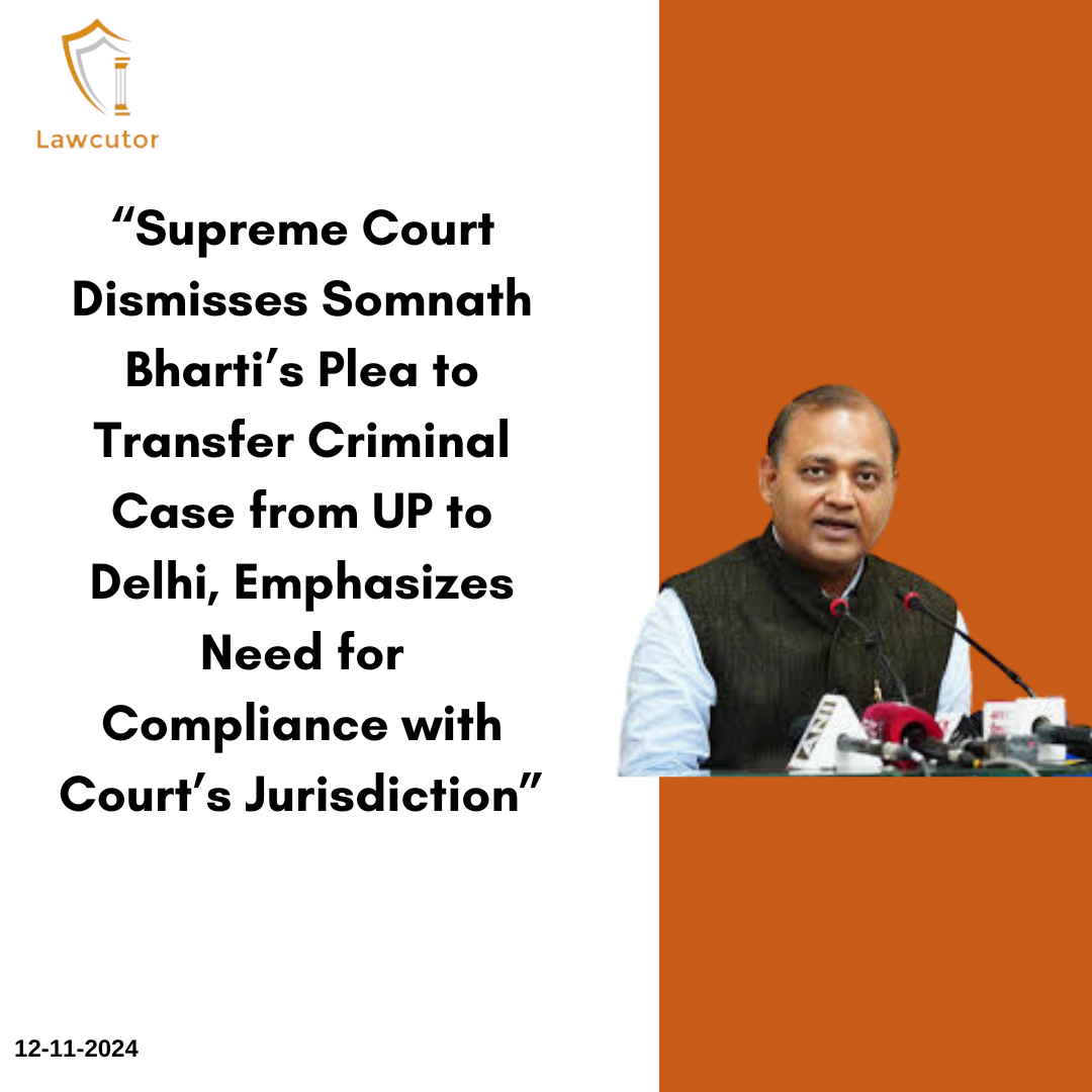 On Tuesday, November 12, 2024, the Supreme Court dismissed a transfer petition filed by Aam Aadmi Party (AAP) leader and former Delhi Law Minister Somnath Bharti, who sought to relocate a criminal case against him from Sultanpur, Uttar Pradesh, to New Delhi. The case involves charges of criminal intimidation and promoting enmity between groups, stemming from Bharti’s statements about Uttar Pradesh’s healthcare and educational facilities during a campaign event in Prayagraj in December 2020.