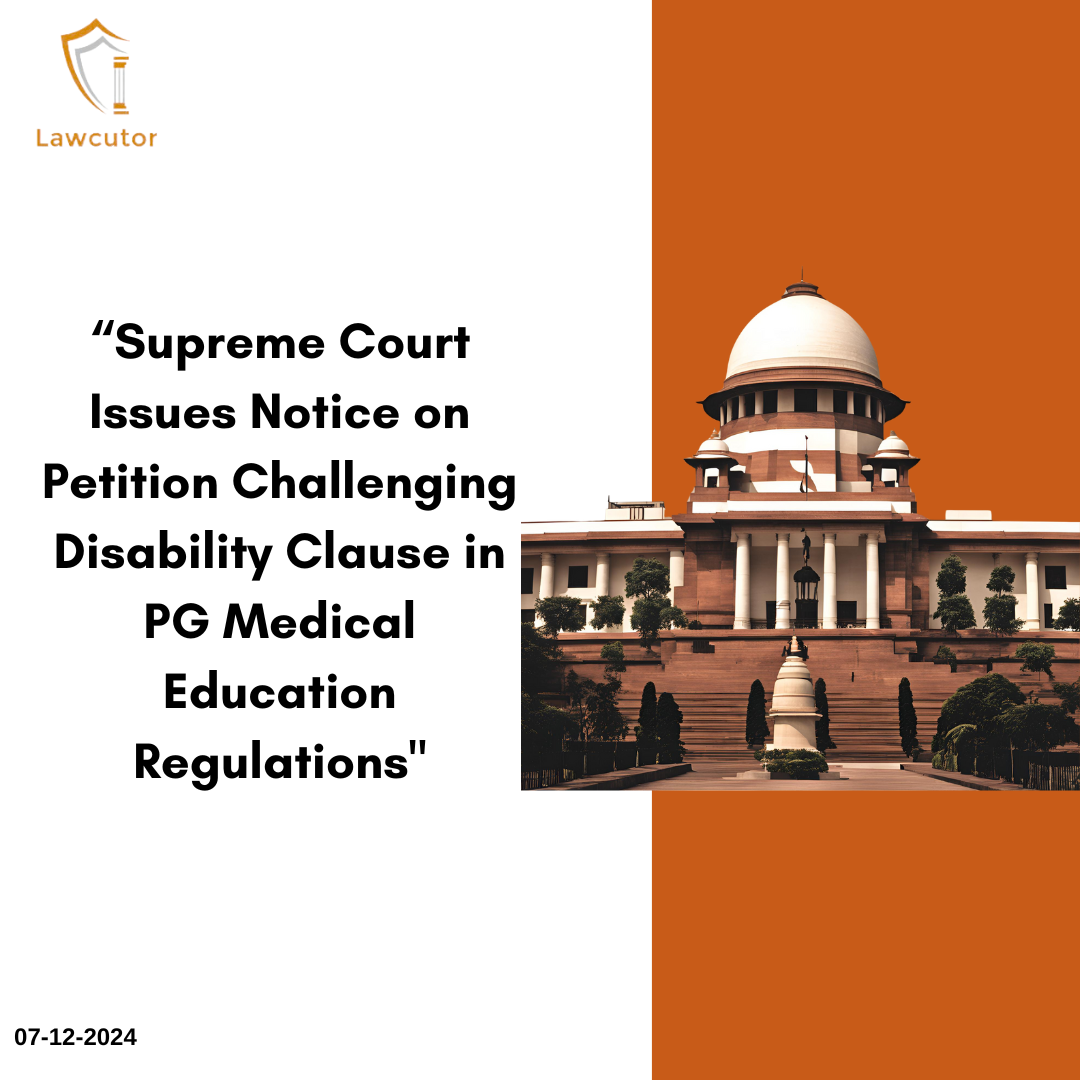 The Supreme Court has issued notice on a petition challenging Regulation 4.8 of the Post-Graduate Medical Education Regulations, 2023, which deems individuals with hearing disabilities of 40% or more ineligible for admission to PG medical courses unless their hearing loss is reduced to less than 40% with assistive devices. The petition, filed by Tina Sharma, a medical student with 70% hearing impairment, argues that this provision is discriminatory and violates constitutional rights under Articles 14, 19(1)(g), and 21, as well as the Rights of Persons with Disabilities Act, 2016.