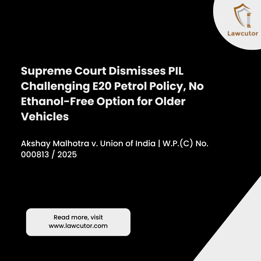 In a significant ruling today, the Supreme Court of India dismissed a Public Interest Litigation (PIL) that sought to challenge the Union Government’s Ethanol Blending Programme, specifically the mandatory nationwide rollout of 20% ethanol-blended petrol (E20). The bench, comprising Chief Justice B.R. Gavai and Justice K. Vinod Chandran, refused to intervene in the policy, emphasizing that such decisions fall within the government’s domain to promote energy security, reduce crude oil imports, and support environmental sustainability.