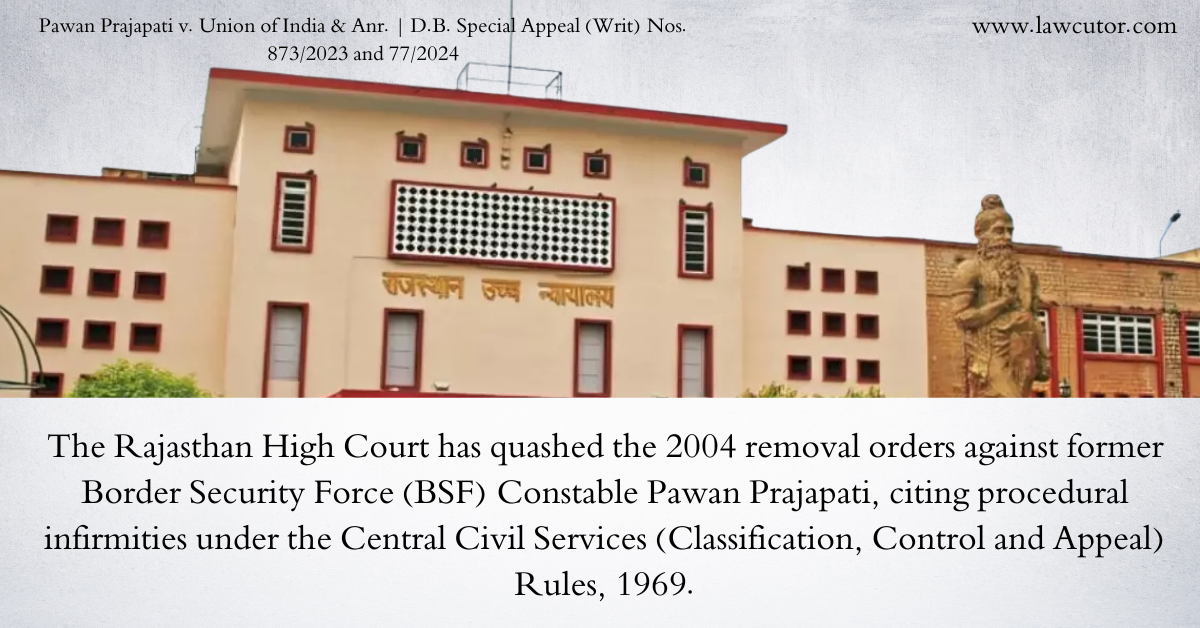 The Rajasthan High Court has quashed the 2004 removal orders against former Border Security Force (BSF) Constable Pawan Prajapati, citing procedural infirmities under the Central Civil Services (Classification, Control and Appeal) Rules, 1969. A division bench of Acting Chief Justice Sanjeev Prakash Sharma and Justice Sangeeta Sharma, in its February 27, 2026, judgment, remitted the matter for a reasoned fresh order after granting both sides a hearing opportunity, while directing immediate reinstatement but denying back wages from the removal date.