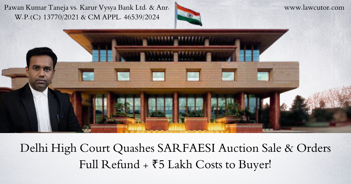 In a powerful pro-buyer judgment, the Delhi High Court has held Karur Vysya Bank accountable for auctioning a Rohini flat with hidden encumbrances under the SARFAESI Act. The buyer, who paid Rs. 9.93 lakh and took a home loan from the same bank, was left with nothing but litigation for 11 years.