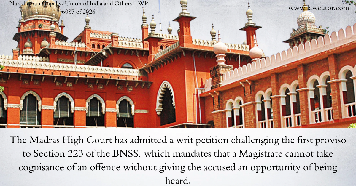 The Madras High Court has admitted a writ petition challenging the first proviso to Section 223 of the Bharatiya Nagarik Suraksha Sanhita (BNSS), 2023, which mandates that a Magistrate cannot take cognisance of an offence without giving the accused an opportunity of being heard.