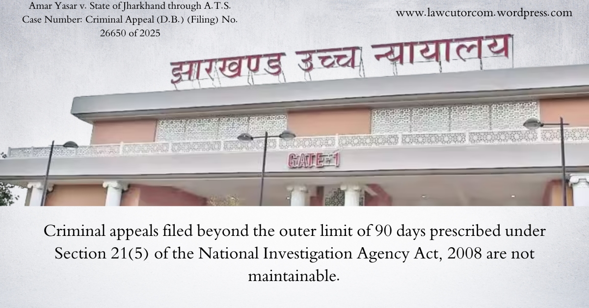 The Jharkhand High Court has ruled that criminal appeals filed beyond the outer limit of 90 days prescribed under Section 21(5) of the National Investigation Agency Act, 2008 are not maintainable. The Division Bench clarified that courts have no power to condone delay beyond this statutory maximum period, and the provisions of the Limitation Act, 1963 cannot be invoked to extend the limitation.