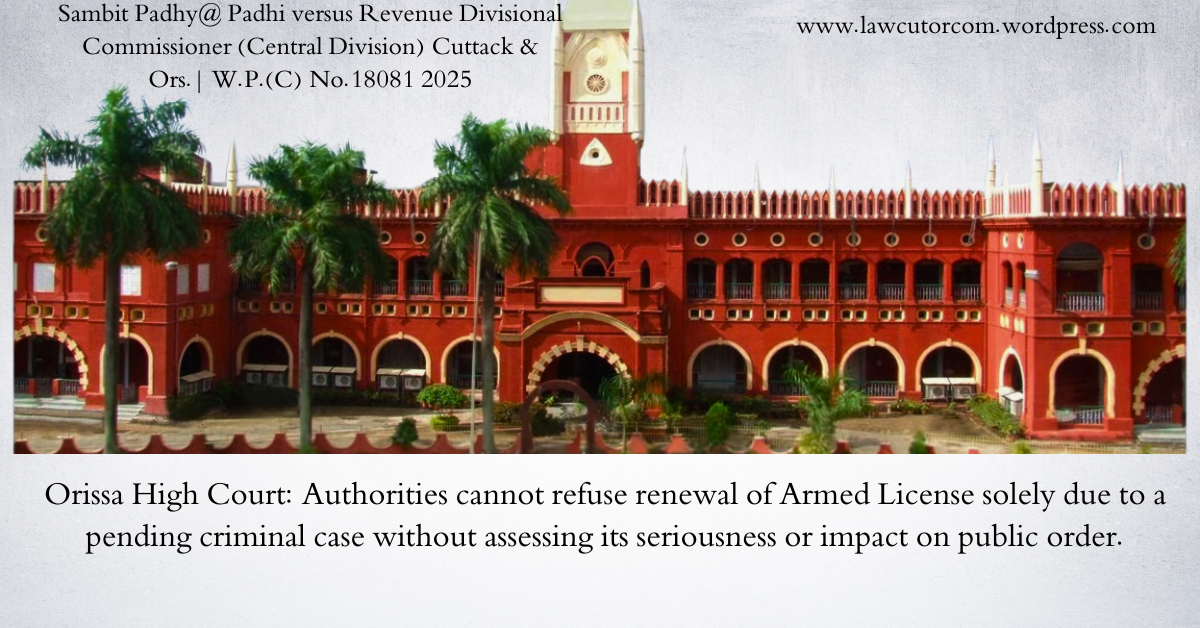 In a significant ruling reinforcing safeguards under the Arms Act, the Orissa High Court has quashed the cancellation of a businessman’s arms licence. The court held that authorities cannot refuse renewal solely due to a pending criminal case without assessing its seriousness or impact on public order.