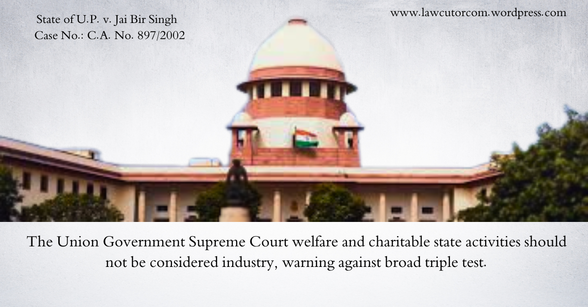 The Union Government on Tuesday told the Supreme Court that welfare activities and charitable functions undertaken by the State cannot be treated as “industry” under labour law, cautioning against an overbroad application of the triple test laid down in Bangalore Water Supply and Sewerage Board v. A. Rajappa (1978).