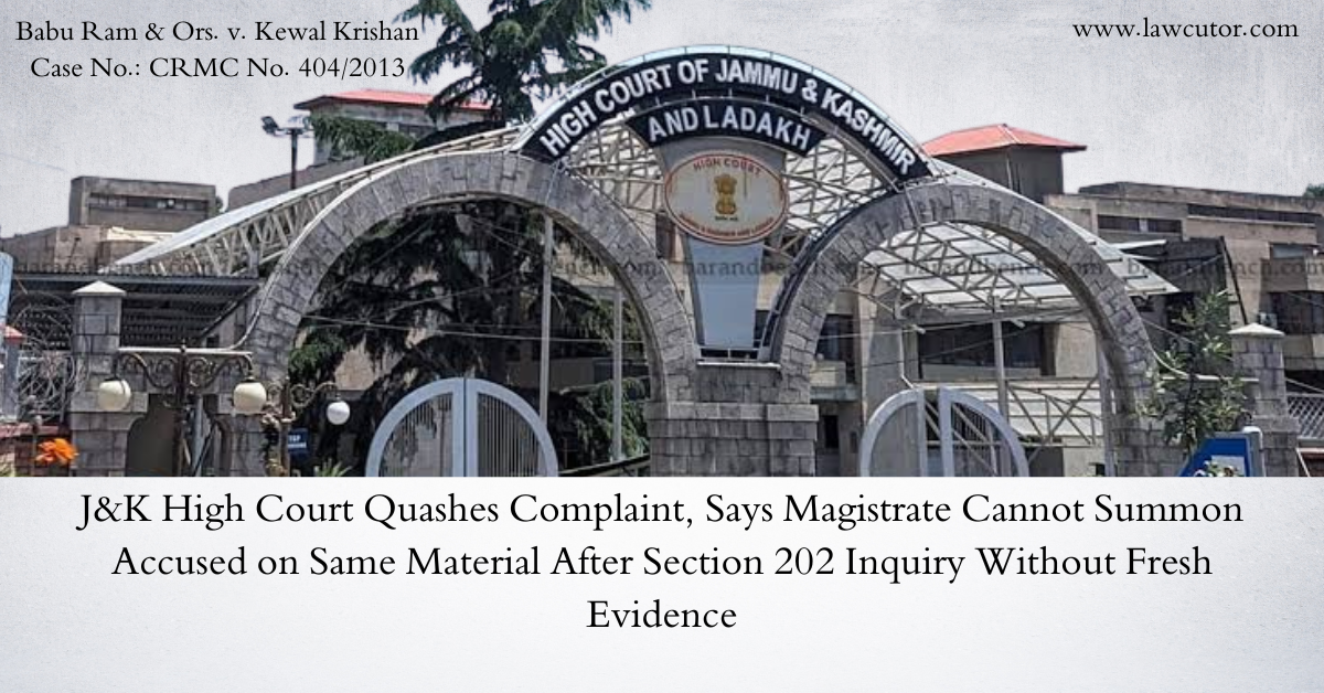 The High Court of Jammu & Kashmir and Ladakh at Jammu has quashed a criminal complaint filed under Sections 451, 323, 504, 506 and 34 of the Ranbir Penal Code along with the order dated 18 November 2013 whereby the Judicial Magistrate Ist Class, Sunderbani issued process against the petitioners. Justice Sanjay Dhar allowed the petition filed under Section 482 CrPC observing that once a Magistrate, after recording preliminary evidence, is not satisfied about the sufficiency of material and orders an inquiry under Section 202 CrPC, he cannot later pass an order summoning the accused on the very same material without any additional evidence in favour of the complainant.