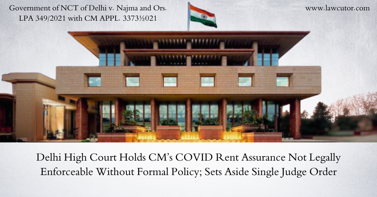 The Delhi High Court on 06 April 2026, held that an assurance or promise extended by the Chief Minister of Delhi during a press conference on 29 March 2020, to bear the rent of poor and poverty-stricken migrant tenants during the nationwide COVID-19 lockdown, does not constitute an enforceable legal promise in the absence of any formal policy, Office Memorandum, Notification, Circular or other instrument having the force of law. A division bench comprising Justices C. Hari Shankar and Om Prakash Shukla set aside the single judge order dated 22 July 2021 which had held the assurance legally enforceable by invoking the principles of promissory estoppel and legitimate expectation.