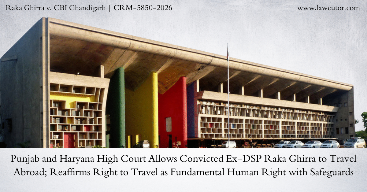 The Punjab & Haryana High Court on 30 March 2026 allowed the application filed by Raka Ghirra, a 61-year-old former Deputy Superintendent of Police convicted in a bribery case, seeking permission to travel abroad. Justice Aman Chaudhary granted her leave to visit Spain, Switzerland and Czechia for a period of one month from 10.04.2026 to 10.05.2026, subject to stringent conditions. The Court reiterated that the right to travel abroad is an important basic human right.