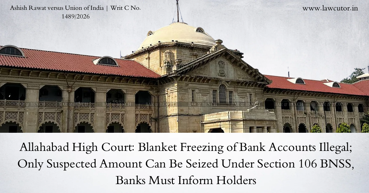 The Allahabad High Court has delivered a landmark judgment clarifying the scope and procedure for freezing of bank accounts during investigation of cyber offences under Section 106 of the Bharatiya Nagarik Suraksha Sanhita, 2023 (BNSS). A division bench comprising Justice Ajit Kumar and Justice Swarupama Chaturvedi, while deciding a batch of ten writ petitions, held that the power of the police to seize property under Section 106 BNSS does not extend to freezing the entire operation of a bank account. The seizure must be limited strictly to the amount alleged or suspected to have been stolen or linked to the commission of an offence. The Court observed: