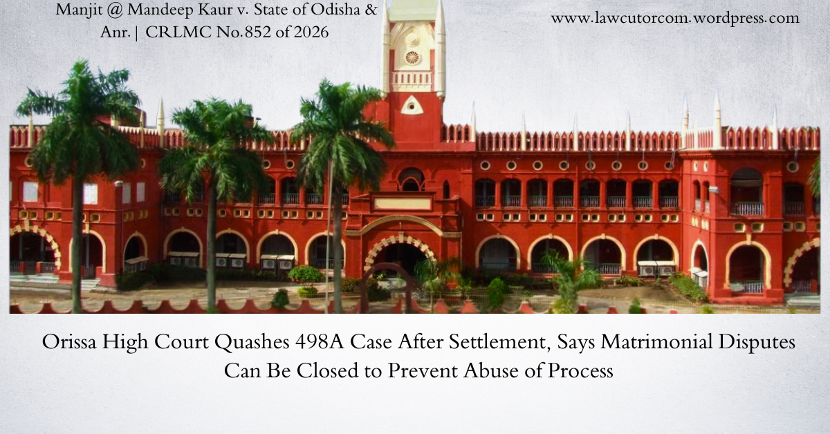 The Orissa High Court has quashed the entire criminal proceedings initiated against a woman in connection with Udit Nagar P.S. Case No.64 of 2016 corresponding to G.R. Case No.371 of 2016 pending before the Court of learned S.D.J.M.(P), Rourkela, after the parties amicably settled their matrimonial dispute. Dr. Justice Sanjeeb Kumar Panigrahi, while exercising the inherent power under Section 528 of the Bharatiya Nagarik Suraksha Sanhita, allowed the CRLMC petition filed by Manjit @ Mandeep Kaur and observed that prolonged adversarial litigation in matrimonial matters not only aggravates bitterness between the parties but also results in unnecessary consumption of judicial time. The Court noted that the prosecution case stemmed from a complaint filed by the opposite party No.2 on 12.03.2016 alleging that she had been brutally assaulted by her mother-in-law, sister-in-law and brother-in-law on 11.03.2016 and again on the next day, resulting in bleeding injuries, leading to registration of the case under Sections 498-A, 323, 354, 506 and 34 of the IPC.