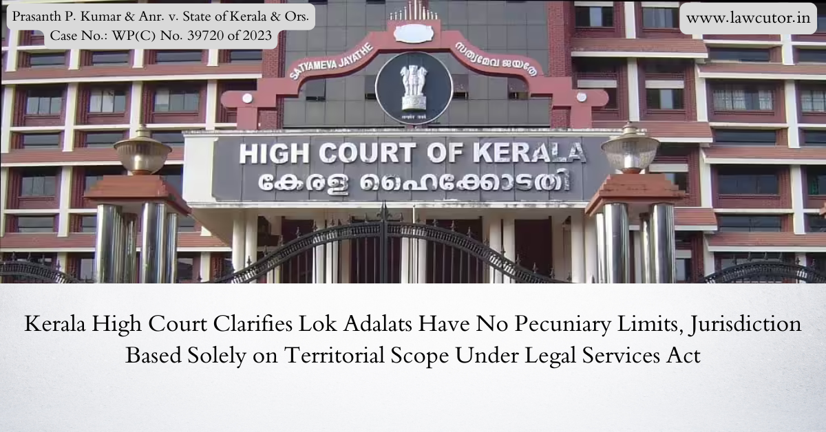 The Kerala High Court has held that a Taluk Legal Services Committee has jurisdiction to entertain a complaint and pass an award under Section 19(5) of the Legal Services Authorities Act, 1987, even if the subject matter involves a high pecuniary value, inasmuch as the provision speaks only of territorial jurisdiction and does not prescribe any pecuniary jurisdiction. Justice Harisankar V. Menon observed that the statute does not require the existence of a Sub Court or any monetary limit for the Taluk Legal Services Authority to exercise jurisdiction, and that the only requirement is that the dispute falls within the territorial limits for which the Lok Adalat is organized. The Court further clarified that a mere allegation of fraud, without conclusive proof, cannot be a ground to set aside a Lok Adalat award, especially when the parties appeared voluntarily and were accompanied by a lawyer.
