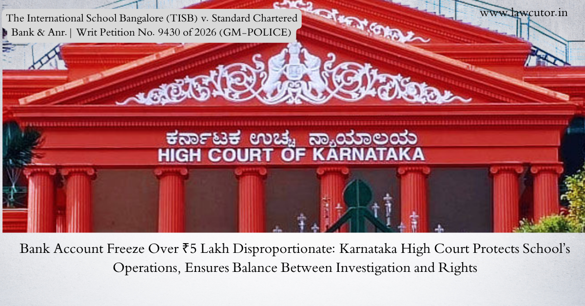 The Karnataka High Court has allowed the writ petition filed by The International School Bangalore (TISB), an educational institution functioning under the Trust of National Academy for Learning (N.A.F.L.) at NAFL Valley, Whitefield-Sarjapur Road, near Dommasandra Circle, Bengaluru, and has quashed the final notice dated 11.03.2026 issued by the Station House Officer, Cyber Crime Police Station, Varanasi, arising out of Crime No.50/2024 for offences punishable under Section 420 of the Indian Penal Code, 1860 and Section 66(D) of the Information Technology Act, 2000. Justice Sachin Shankar Magadum passed the order in Writ Petition No.9430 of 2026 (GM-POLICE) after hearing learned counsel Sri Amit Deshpande for the petitioner and Sri Avinash B.C. for respondent No.1 – Standard Chartered Bank, while dispensing with notice to respondent No.2.