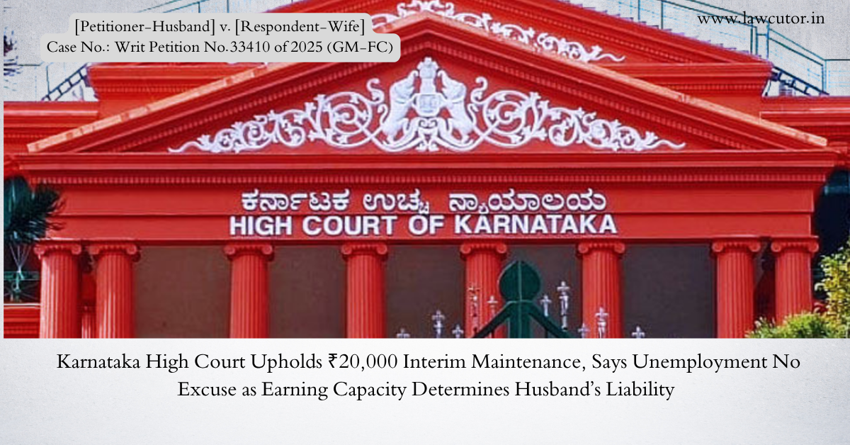 The Karnataka High Court has dismissed the writ petition filed by a qualified software engineer under Article 227 of the Constitution of India challenging the order dated 04.08.2025 passed by the IV Additional Principal Family Judge, Bengaluru on IA No.2 in Crl.Misc.No.685/2022, whereby the Family Court had directed the petitioner-husband to pay interim maintenance of Rs.20,000/- per month to his estranged wife under Section 125 of the Code of Criminal Procedure, 1973. Justice Dr. K. Manmadha Rao, while pronouncing the order dated 17th April, 2026 in Writ Petition No.33410 of 2025 (GM-FC), held that the impugned order does not suffer from any jurisdictional error or patent illegality and is just and reasonable.