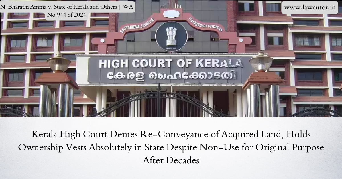 The Division Bench of the Kerala High Court comprising Justice Devan Ramachandran and Justice M.B. Snehalatha has dismissed Writ Appeal No.944 of 2024 filed by N. Bharathi Amma challenging the judgment dated 03.06.2024 in W.P.(C) No.7466 of 2014. The appellant had sought a declaration that her land acquired for the Kallada Irrigation Project was taken without following due process, quashing of a Government Order permitting use of such land for other public purposes if the original purpose did not fructify, and a direction to the State to re-convey the property to her on the ground that the project had not materialised even after more than 37 years. The Court observed that the issues raised were not novel and had been answered repeatedly by the Supreme Court in the past.