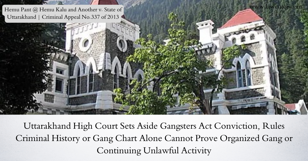 The Uttarakhand High Court has allowed Criminal Appeal No.337 of 2013 filed by Hemu Pant @ Hemu Kalu and Manish @ Kanchu Matiyani, setting aside their conviction and sentence under Sections 2/3 of the Uttar Pradesh Gangsters and Anti-Social Activities (Prevention) Act, 1986. Justice Ashish Naithani, while pronouncing the judgment on 21 April 2026, held that the prosecution had failed to establish the essential ingredients of the offence beyond reasonable doubt. The Court observed that mere criminal antecedents or inclusion in a police-prepared gang chart cannot, by themselves, justify conviction under the special statute in the absence of cogent evidence demonstrating the existence of an organized gang and continuity of unlawful activity in furtherance of a common object.