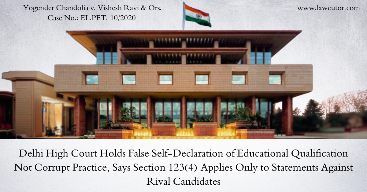 The Division Bench of the Delhi High Court comprising Justices Dinesh Mehta and Vinod Kumar has answered a reference arising from an election petition by holding that a false declaration made by a candidate about his own educational qualification in the affidavit and Form 26 filed along with the nomination paper does not amount to a corrupt practice under Section 123(4) of the Representation of the People Act, 1951. The Bench ruled that Section 123(4) is attracted only when a candidate or his agent publishes a false statement of fact relating to the personal character or conduct of another candidate, with the intention of prejudicing that candidate’s electoral prospects. A self-declaration, even if false, cannot fall within the provision because a candidate cannot logically make a statement against himself to prejudice his own prospects, nor does the filing of a nomination affidavit constitute “publication” as contemplated by the section.