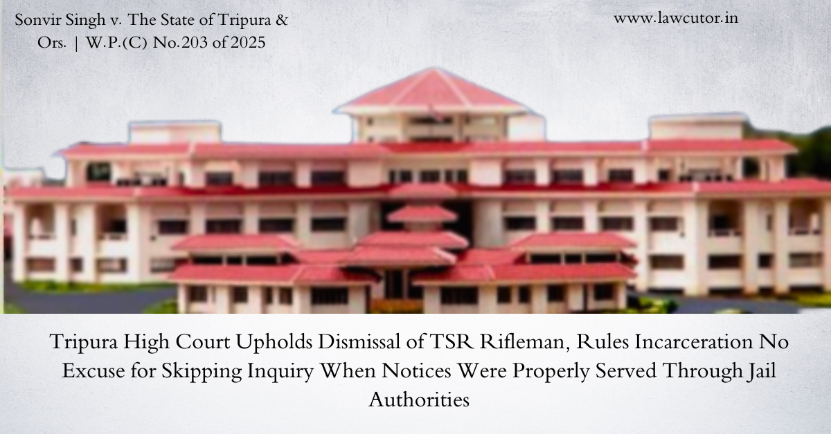 The Tripura High Court has dismissed the writ petition filed by Sonvir Singh, a Rifleman (GD) bearing No.08121114 in the Tripura State Rifles (TSR), challenging his dismissal from service imposed by the disciplinary authority on 31 August 2016. Justice Biswajit Palit, in his judgment dated 22 April 2026 delivered in W.P.(C) No.203 of 2025, held that the petitioner failed to make out any case for interference under Article 226 of the Constitution of India.